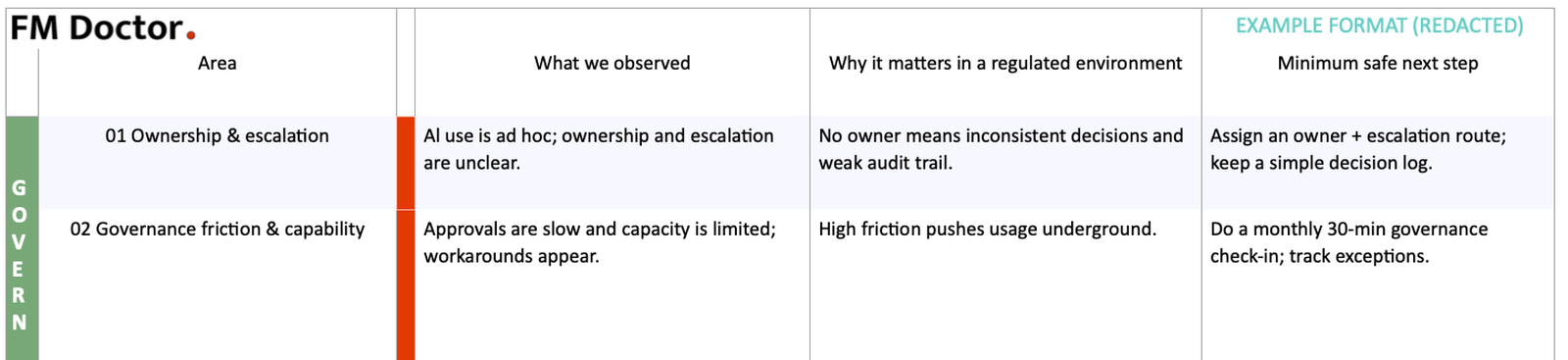 FM Doctor helps operational and leadership teams decide where AI is worth pursuing, where it is not, and what a safe starting point looks like.